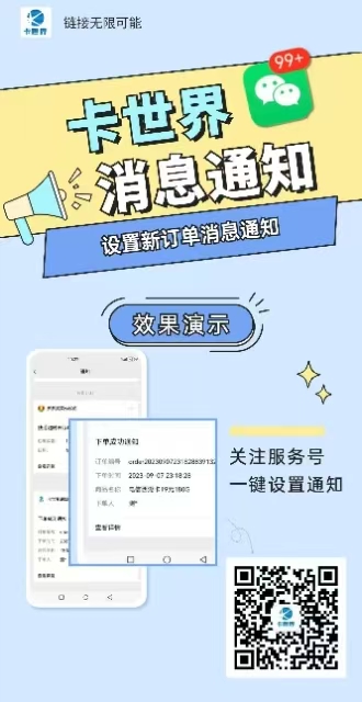 新增功能“新订单服务号通知”,点[订单管理]查看 2025年 9月 22日 20:31:23卡神我 卡神我 管理员 关注 467文章 3评论 公告评论阅读模式 订单管理界面新增功能:新订单服务号通知消息,点击[订单管理]小飞机图标,一键绑定服务号,设置新订单实时通知功能。 文章源自卡世界官网-https://www.ksj123.com/gonggao/1253.html 我要办卡 代理申请