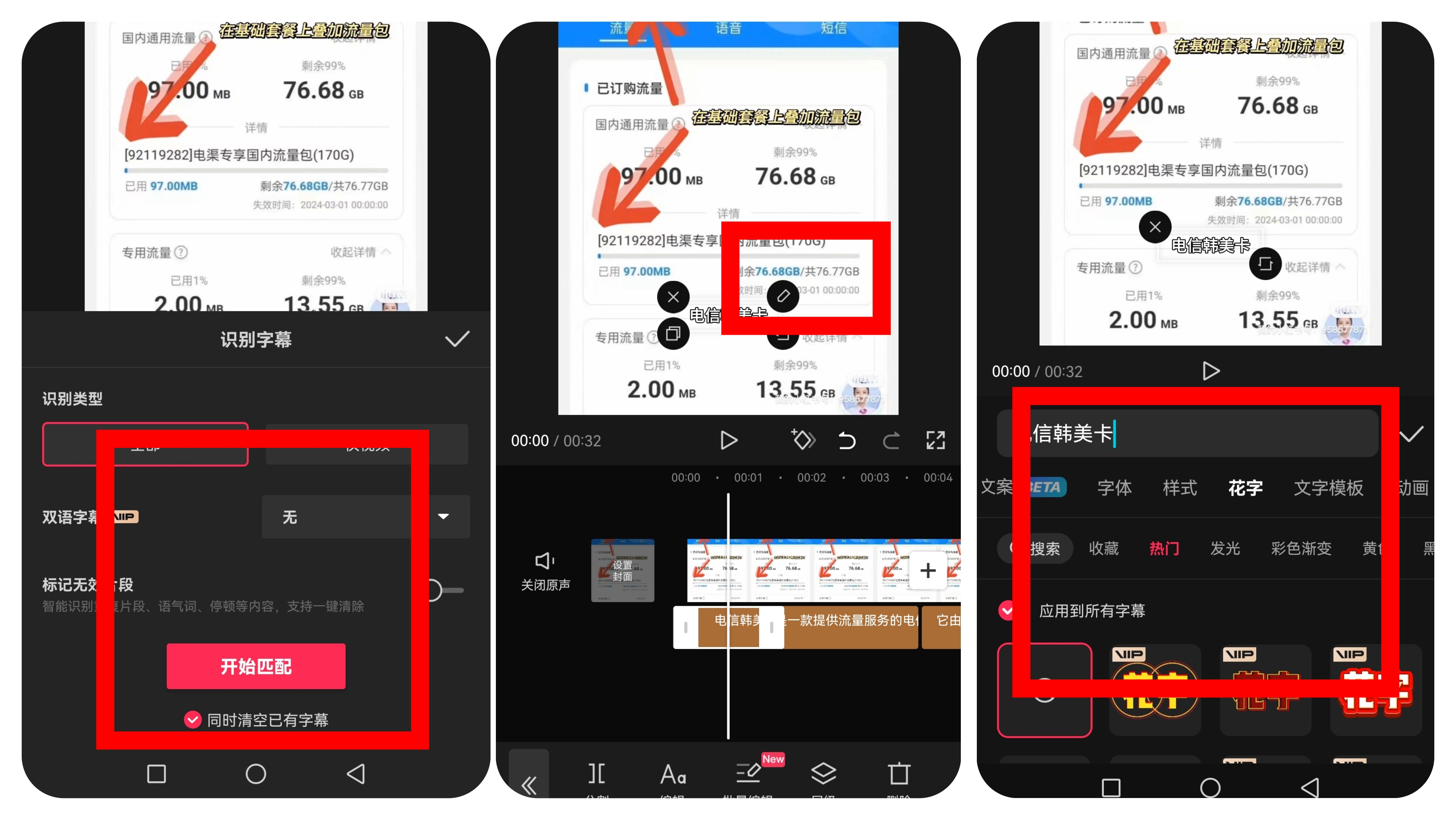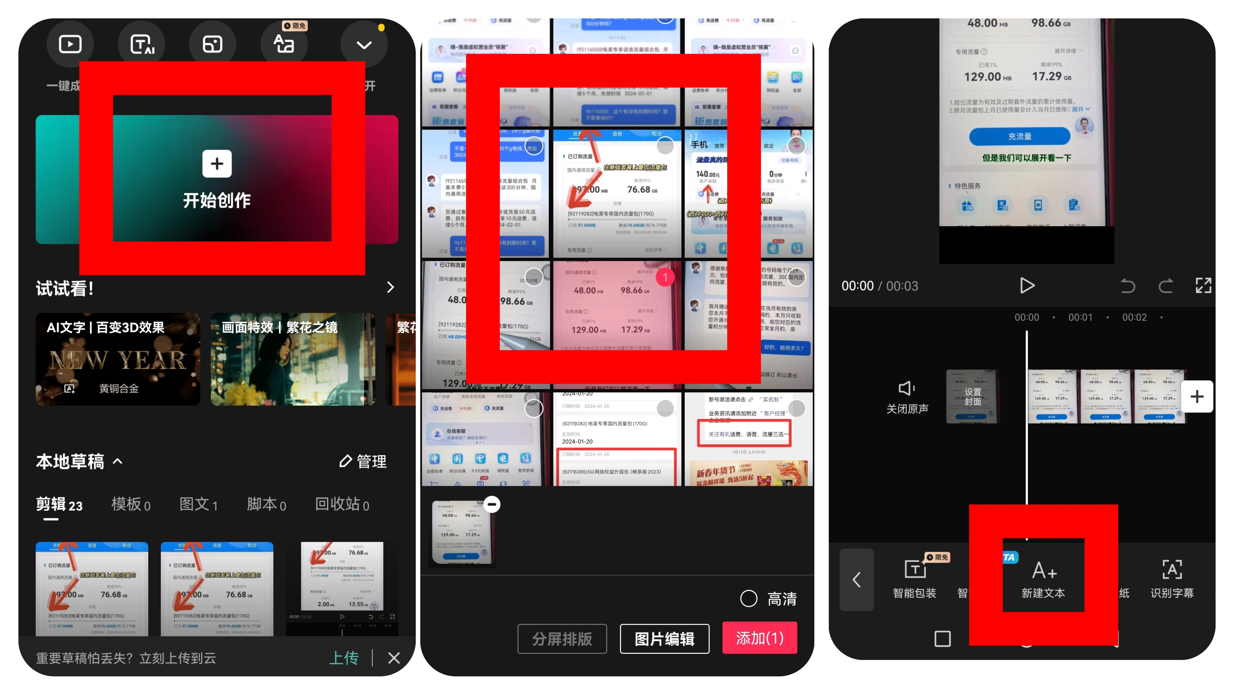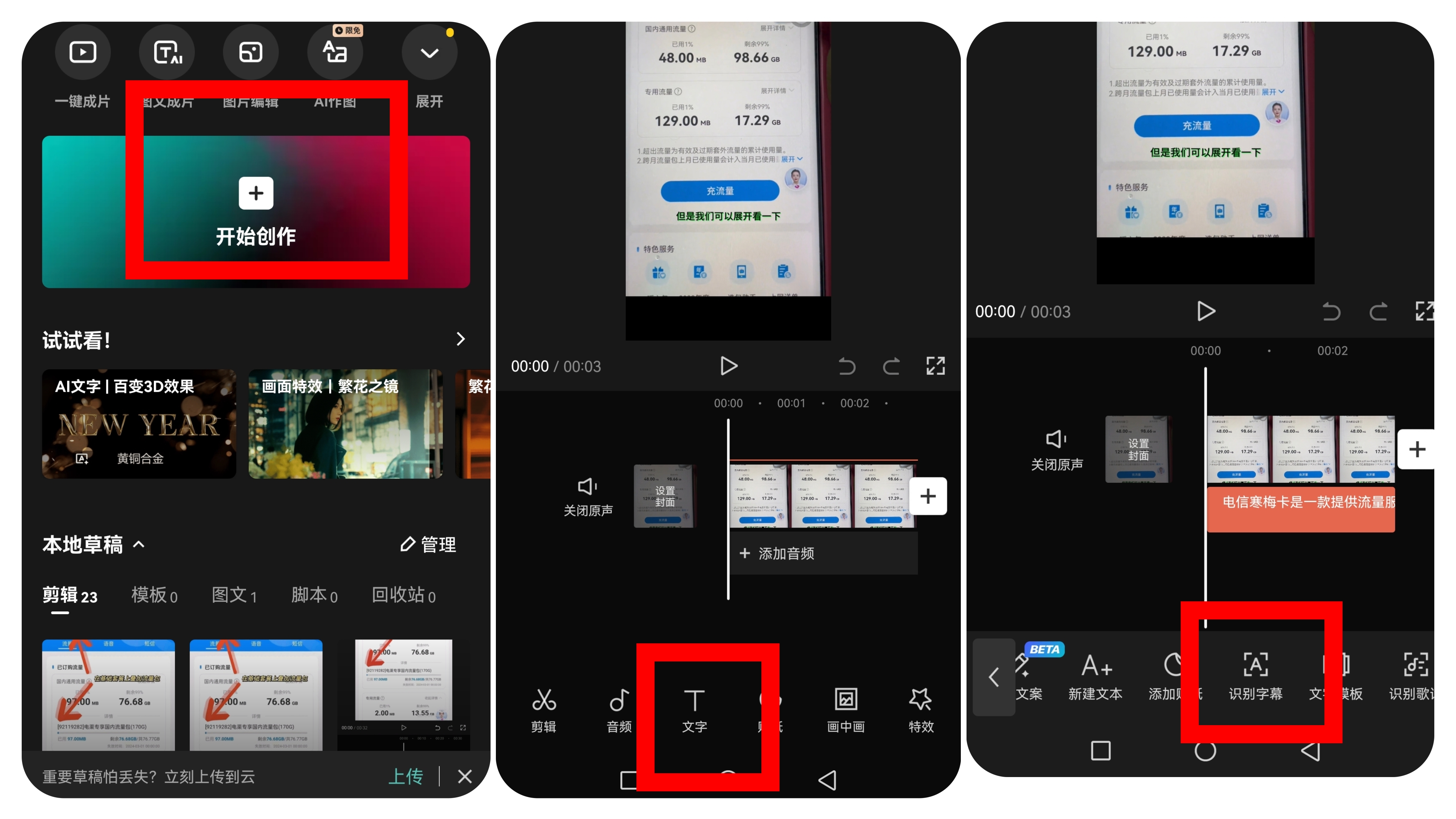 再开始创作,导入刚出的视频--点文字--识别字幕