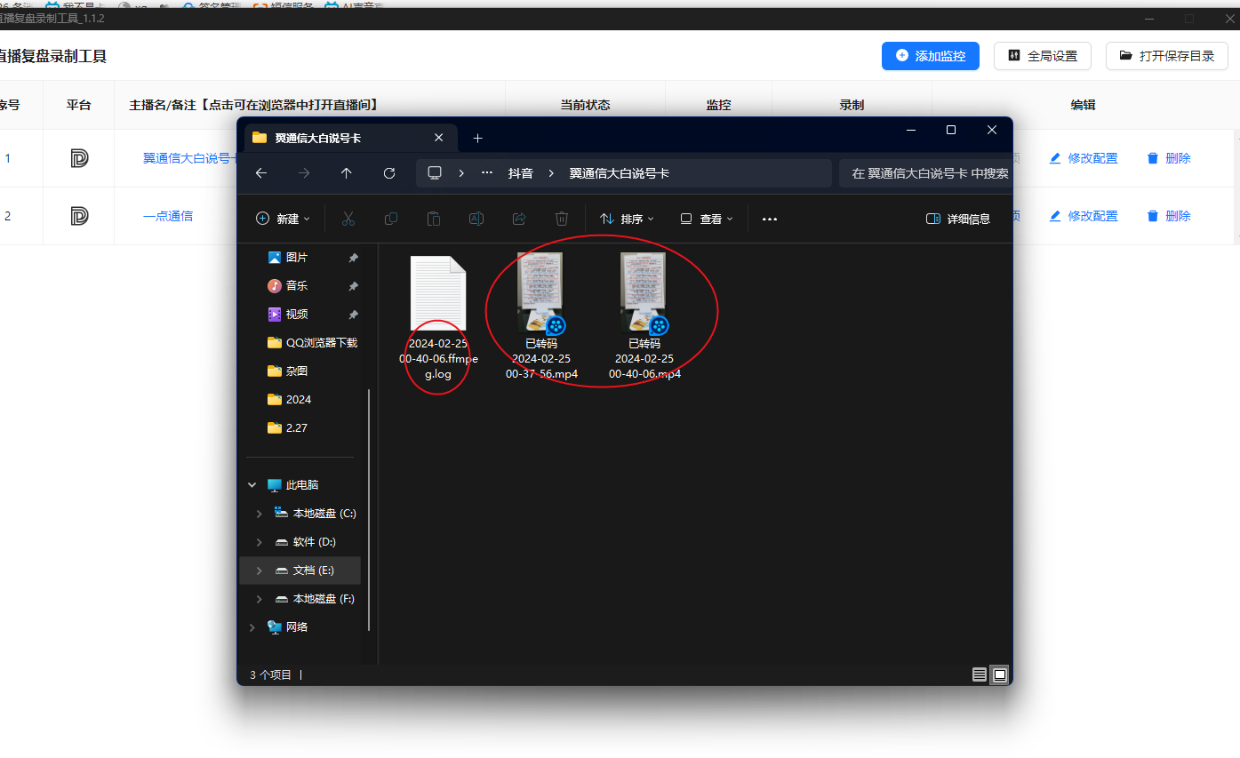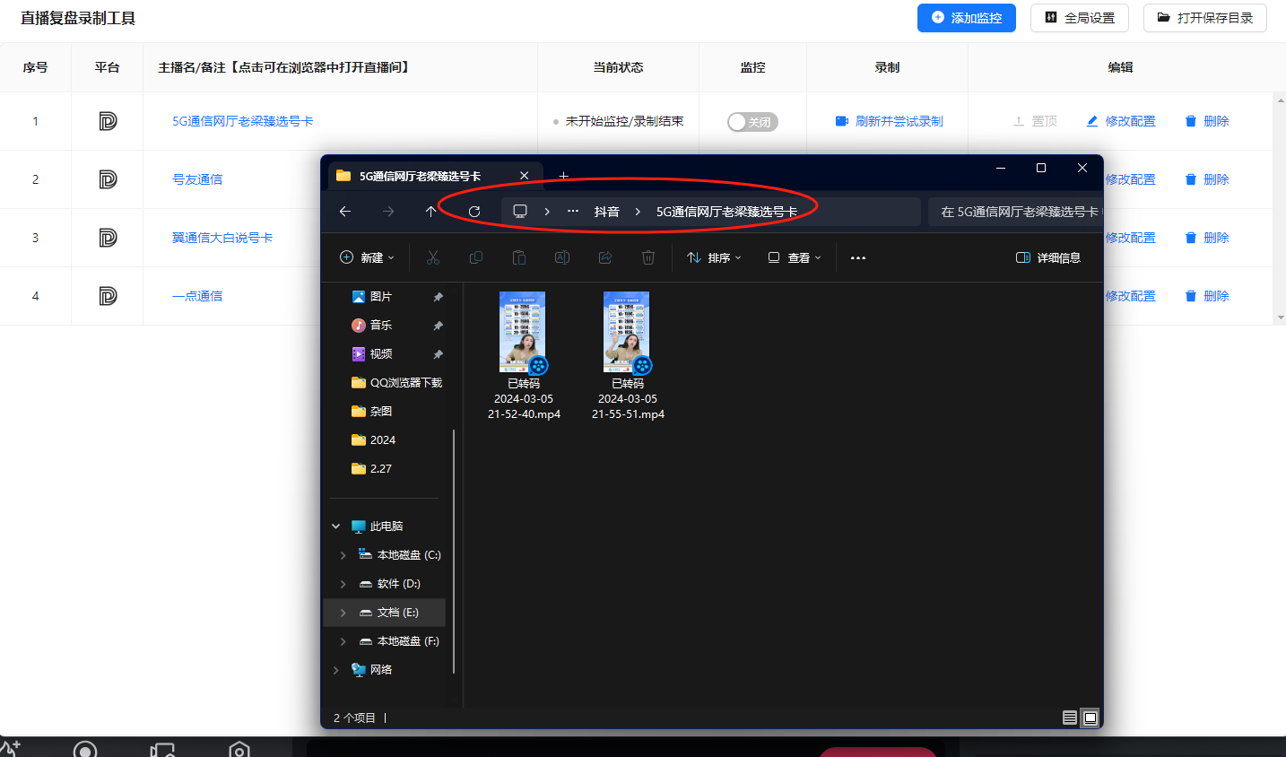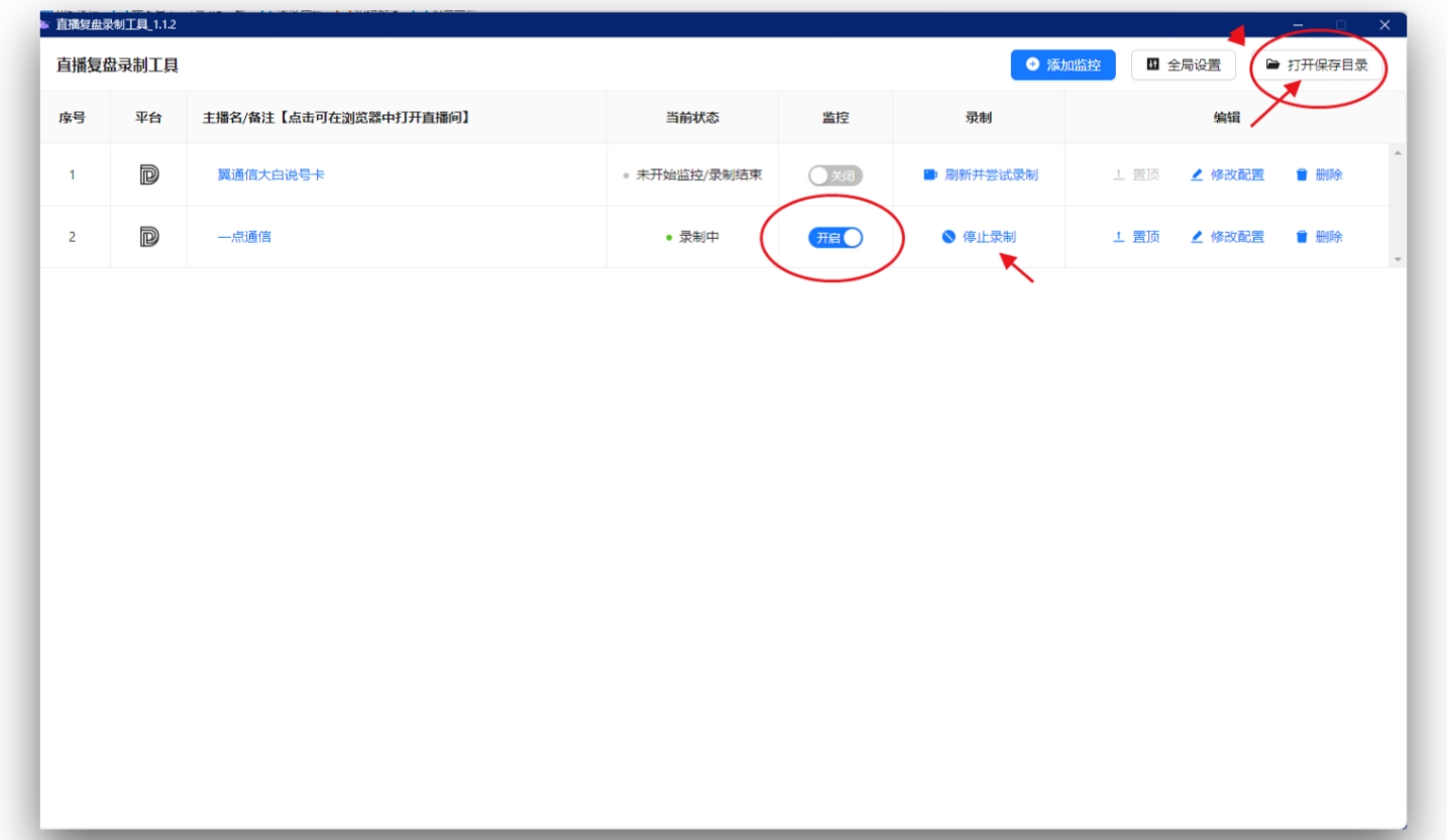 【开启】表示正在录制中、在右上角打开录制目录打开看。