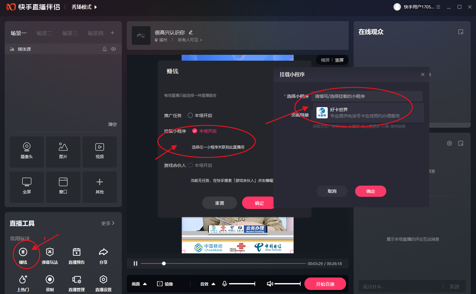 只需要电脑挂机可以播,在本教程找了几个稳定开播的流量卡直播间,稳定转播,在快手直播间挂载卖卡小麻花,可以做到24小时在播流量卡介绍视频,24小时自动有人下单。文章源自卡世界官网-https://www.ksj123.com/jiaocheng/kuaishou/374.html