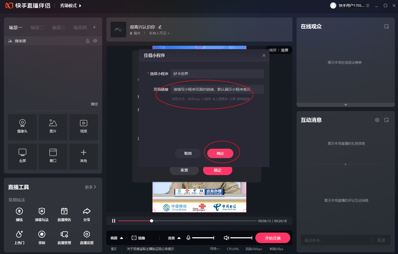 先开通快手卖卡小程序→复制直播间链接→放到直接间下载工具下载→打开快手直播伴侣播放下载画面→开播