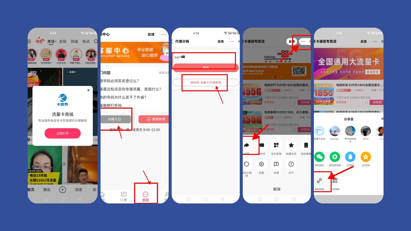 打开小程序--客服--分销入口--输入 第一步的用户名--进入商城---右上角复制