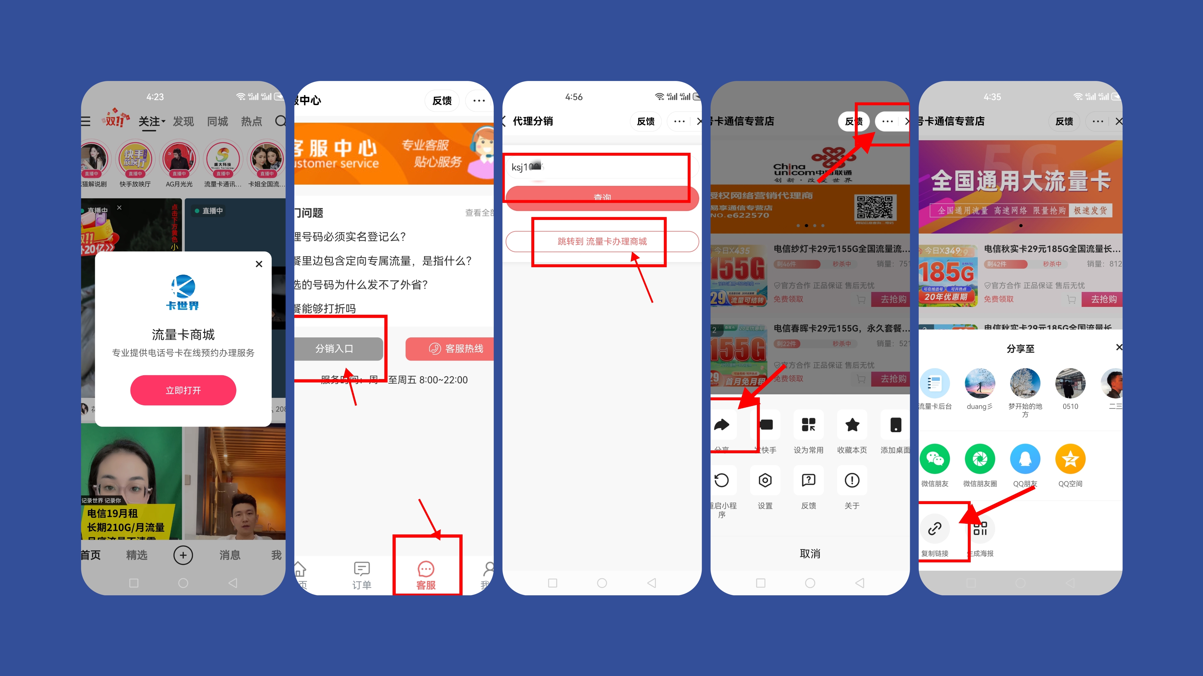 快手扫码后,客服-输入你用户名--查询--进入流量卡商城--右上角分享--复制链接