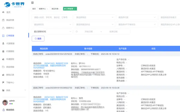 包含了手机卡上下功能和物流查询功能。右上角还增加了API实时,任何一单都不会漏。订单数据分析可以通过数据来进行,卡版发货率的分析。有效的避免了我们作为卡商,无法知道卡版发货率的问题。
